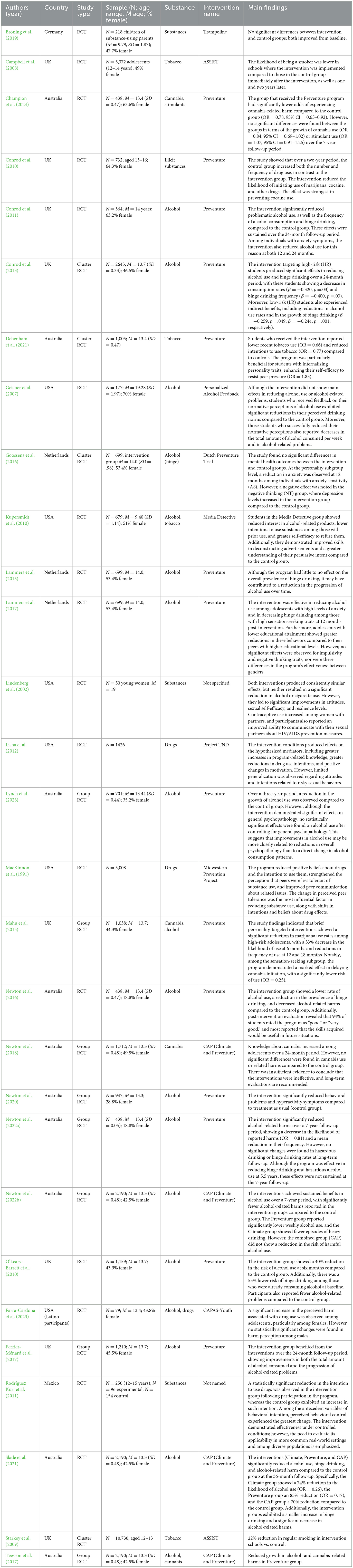 Despite the general low representation, some programs stand out due to their strong empirical basis and level of recommendation. Among them, Preventure emerges as the most scientifically supported program, backed by multiple randomized controlled trials (Champion et al., 2024; Conrod et al., 2010, 2011, 2013; Debenham et al., 2021; Goossens et al., 2016; Lammers et al., 2015, 2017; Lynch et al., 2023; Mahu et al., 2015; O'Leary-Barrett et al., 2010; Perrier-Ménard et al., 2017; Newton et al., 2016, 2018, 2020, 2022a,b; Slade et al., 2021; Teesson et al., 2017). The consistency of its effects, especially among adolescents with high-risk personality profiles, supports the efficacy of personalized interventions. In addition, indirect benefits for low-risk youth and the potential generalization of its effects add further value. In this regard, the evidence underscores the importance of addressing psychosocial vulnerability factors early, in a tailored manner, and based on the identification of individual traits.