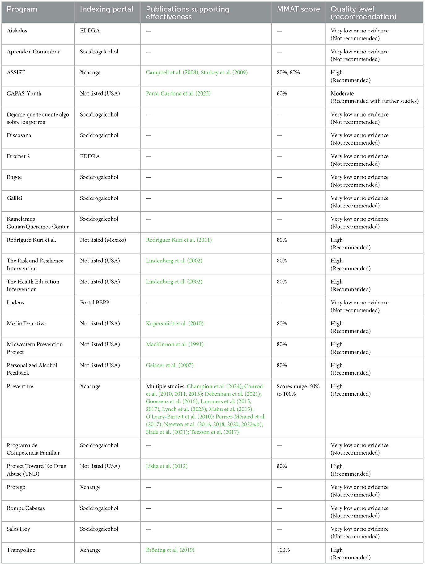 Finally, the quality level of the available evidence for each program and its degree of recommendation was presented, including: (a) program name; (b) indexing portal; (c) supporting efficacy studies (authors, year); (d) MMAT score; and (e) recommendation level. Any discrepancies among authors were resolved through consensus. All extracted data were synthesized and organized in tables using Microsoft Excel.
