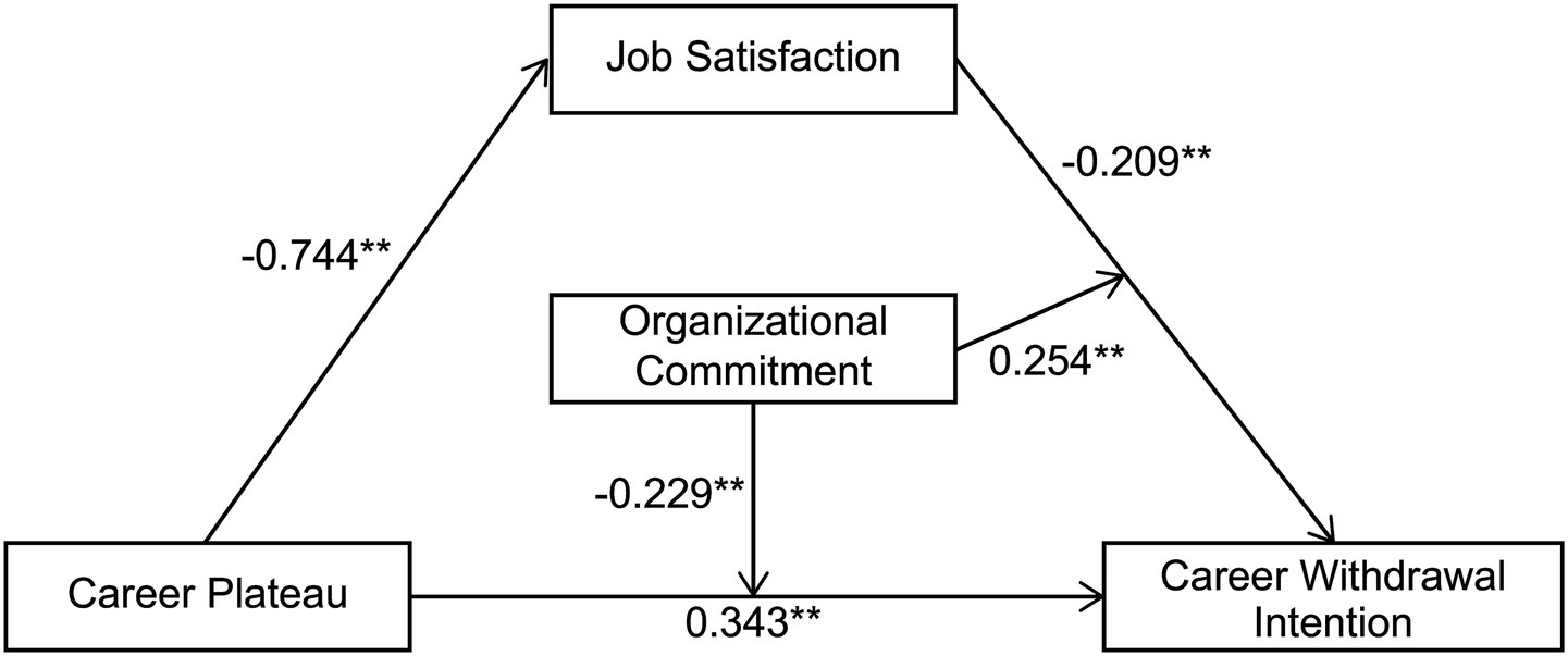 In this model, job satisfaction partially mediated the relationship between career plateau and career withdrawal intention. The mediating effect was (−0.744 * −0.209)/0.343 = 45.309%. Thus, career plateau directly and negatively predicted PE teachers’ intention to quit their careers and indirectly predicted this intention through job satisfaction, confirming H4.
