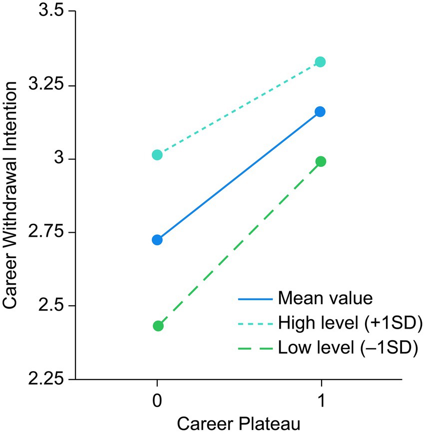Fifth, organizational commitment moderates the direct effect of career plateauing on career withdrawal intention: the positive effect of career plateauing on career withdrawal intention weakens as organizational commitment increases. In other words, for teachers with high organizational commitment, the impact of career plateauing on their willingness to leave is less pronounced.
