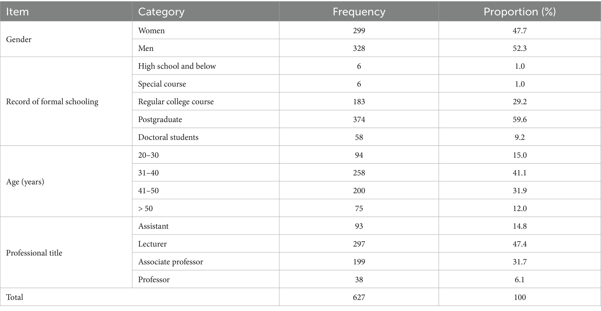 We conducted a survey with teaching assistants, lecturers, and professors engaged in college PE teaching in the Beijing, Tianjin, and Hebei regions. Recruitment was carried out through online promotion and offline invitation. We initially planned to recruit 650 people; ultimately, 627 valid responses were obtained (overall response rate: 96.46%). The response rates of the sample schools were balanced, and they can be considered representative of the target group. In China, the “Beijing–Tianjin–Hebei integration” strategy has been elevated to a national priority, with coordinated education development forming a key aspect of regional collaboration. As a vital component of the education system, PE teachers in colleges and universities play a significant role in advancing collaborative education development. Additionally, the concentration of PE teachers in this region offers substantial talent resources for research. Table 1 shows the sample profile. The study was conducted in accordance with the Declaration of Helsinki and approved by the Hebei University of Economics and Business Institutional Review Board. Written informed consent was obtained from all participants.