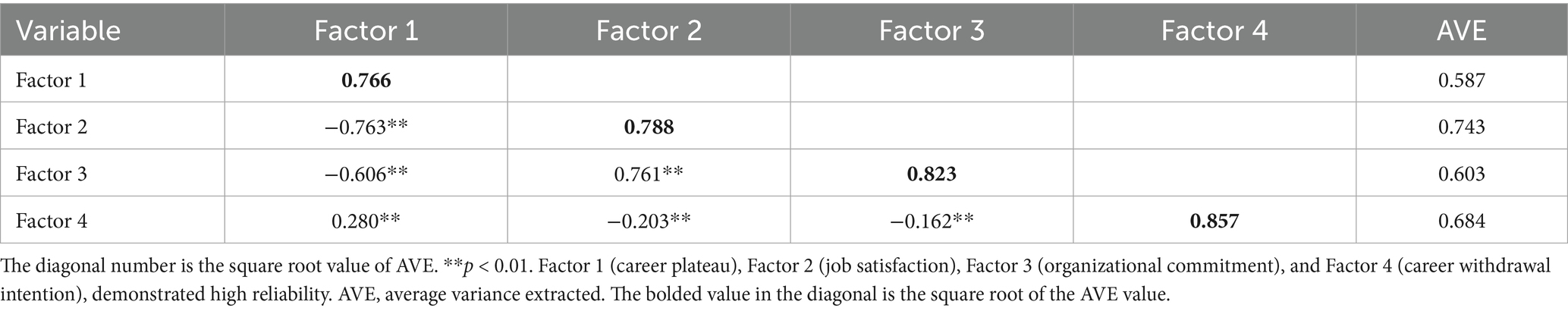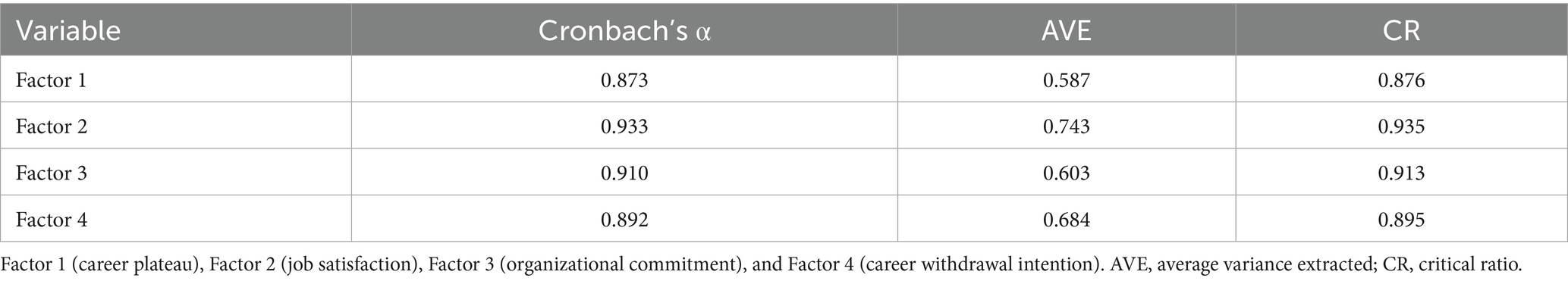 Reliability was assessed through internal consistency and composite reliability. Cronbach’s α coefficient evaluated internal consistency, and composite reliability was represented by the critical ratio value. Cronbach’s α coefficients for all four dimensions were above 0.7, confirming good internal consistency reliability. Additionally, critical ratio values for each dimension exceeded 0.7, indicating strong composite reliability. The questionnaire’s overall scales and subscales, including Factor 1 (career plateau), Factor 2 (job satisfaction), Factor 3 (organizational commitment), and Factor 4 (career withdrawal intention), demonstrated high reliability.