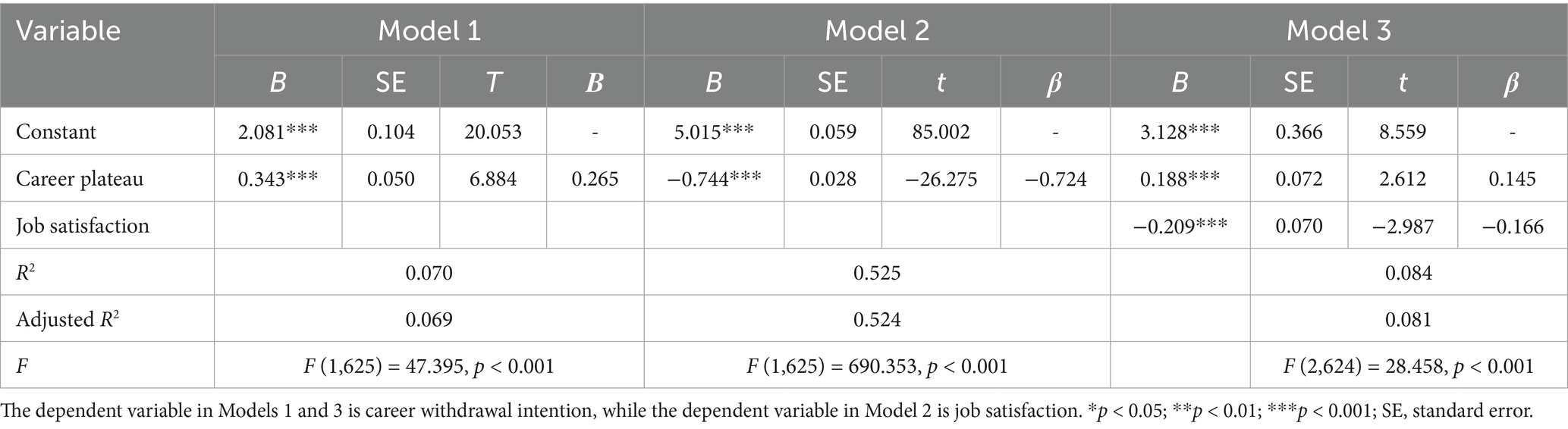 After analyzing the results, it was concluded that the career plateau in Model 1 significantly affected job satisfaction (a). Job satisfaction in Model 2 significantly affected career withdrawal intention (b). The career plateau in Model 3 significantly impacted career withdrawal intention (c’), and * a and c’ were equal, indicating a partial mediating role.