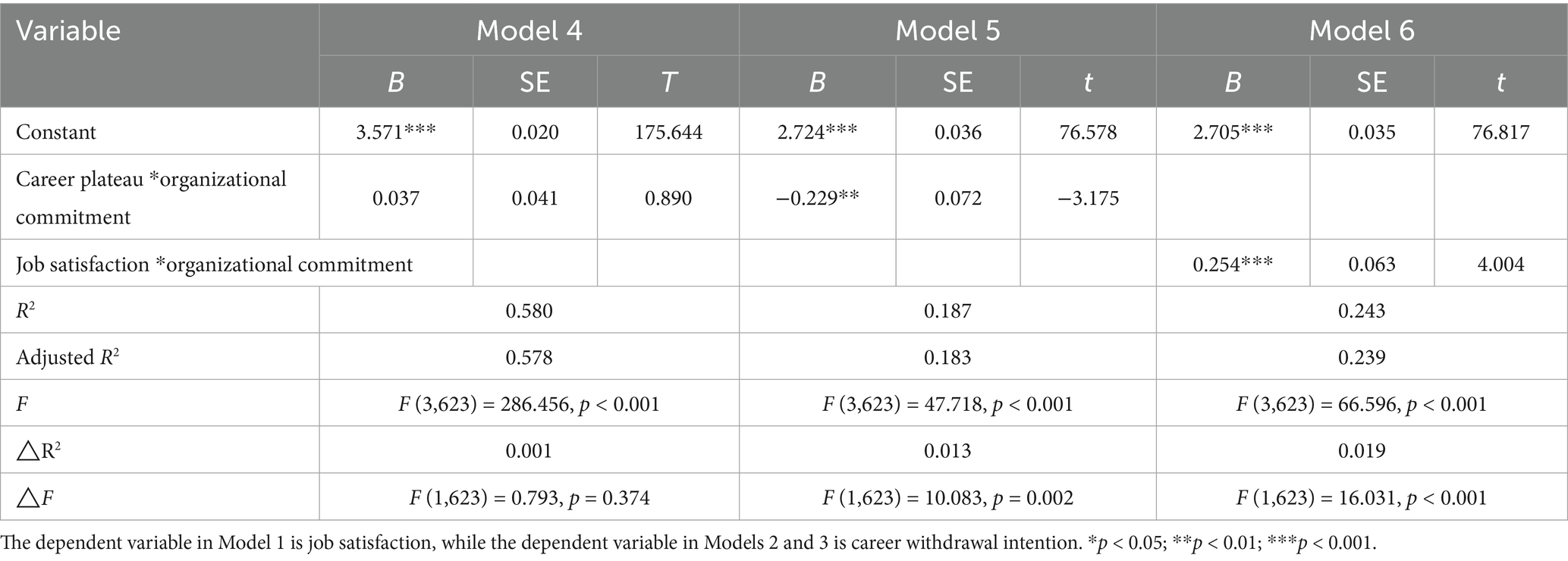 Keywords: job satisfaction, career withdrawal intention, college physical education teacher, career plateau, organizational commitment, mediating effect, moderating effect