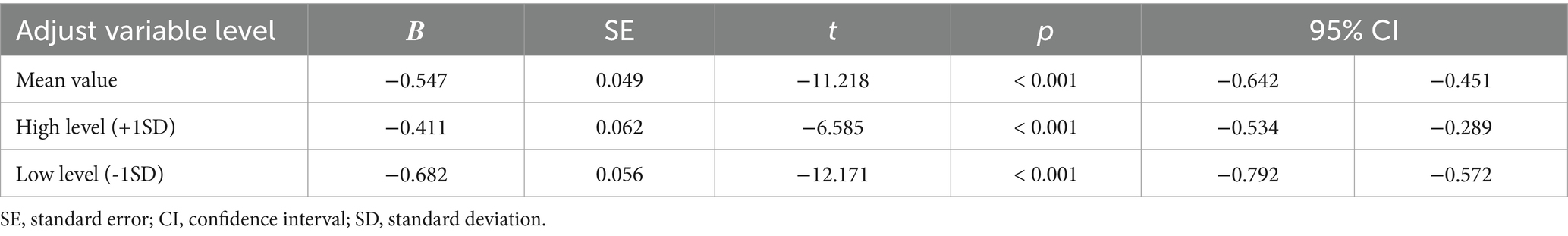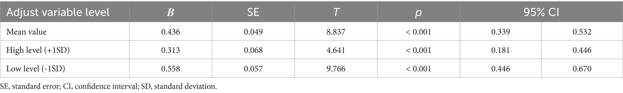 Table 4 presents the results. The value of the total effect of career plateau on career withdrawal intention (c) was 0.343, which was significant (p < 0.001), indicating that the career plateau experienced by college PE teachers significantly strengthened their intention to withdraw from their careers, thus confirming H1.