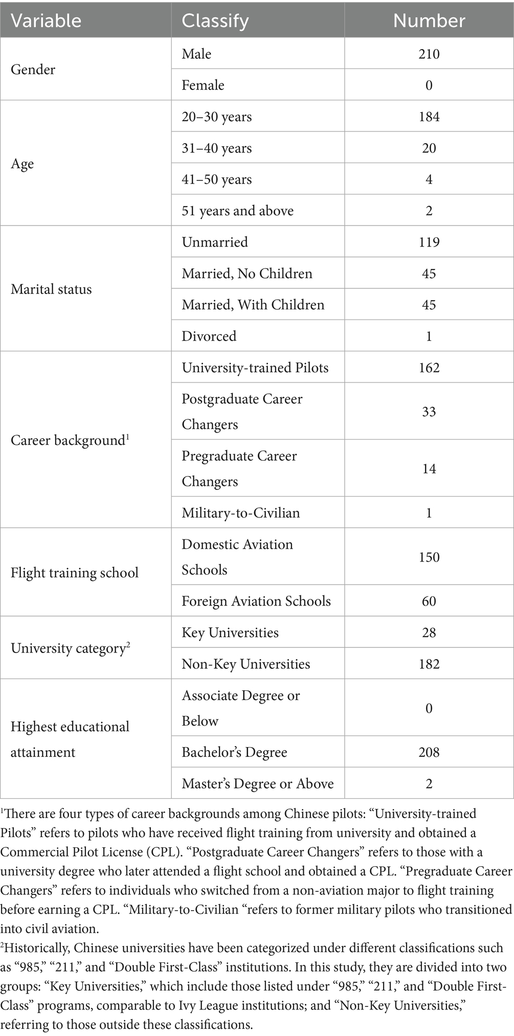 Considering the availability of the data, this study focuses on Chinese civil aviation pilots1 as the research subjects. A questionnaire survey method was employed, with questionnaires distributed and collected through a combination of online and offline methods. The survey scope primarily included pilots from China’s four major aviation groups.2 A total of 250 questionnaires were distributed for this survey, and 220 were returned. After sorting the questionnaire data and removing invalid questionnaires, 210 valid questionnaires were obtained, with a validity rate of 84%.