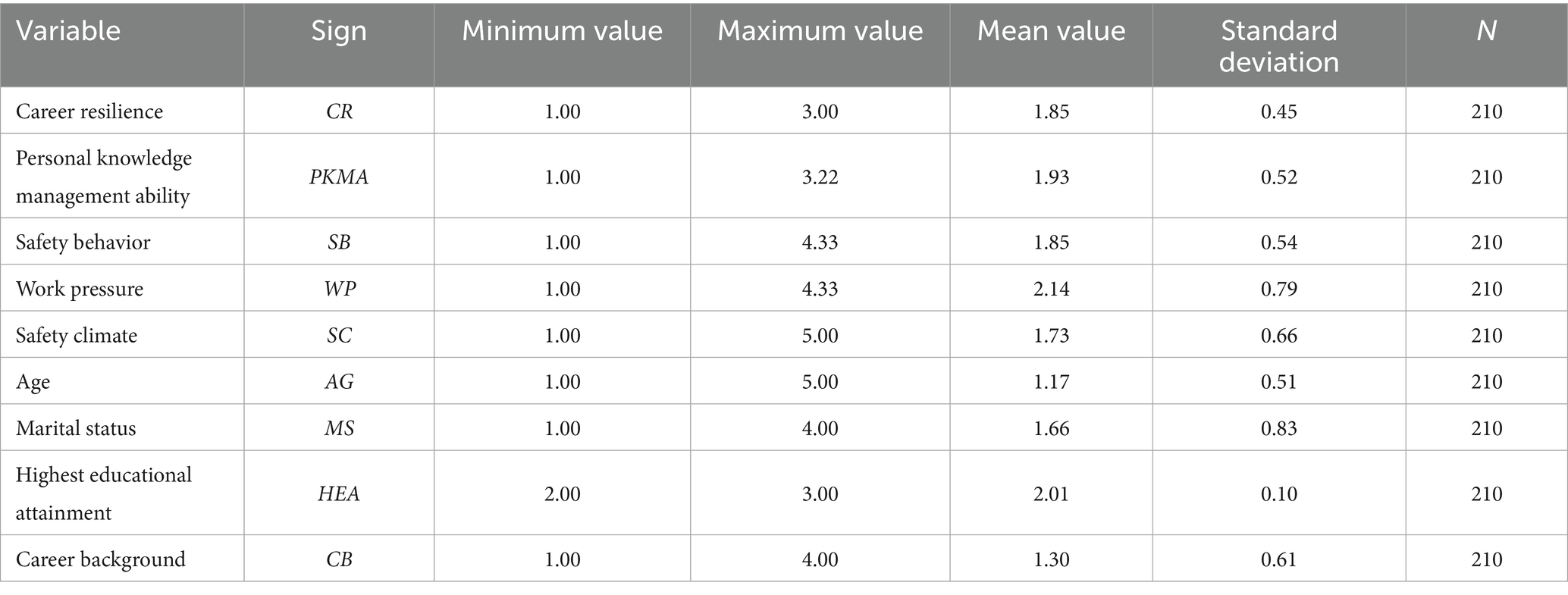 Second, the composite reliability (CR) of career resilience, personal knowledge management ability, safety behavior, safety climate, and work stress scales ranged from 0.773 to 0.876, with CR greater than 0.7, indicating that the scales used in the study had good reliability. Aggregate validity was assessed using average variance extracted (AVE), and the results showed that the AVE values of career resilience, personal knowledge management ability, safety behavior, safety climate, and work pressure scales ranged from 0.365 to 0.585, all greater than the acceptable range of 0.36 (Yang et al., 2023), indicating that the scales used in this study have good convergent validity. Discrimination validity was tested using the HTMT method (heterogeneity-to-homogeneity ratio), and the ratio of inter-trait correlation to intra-trait correlation was less than 0.85, indicating that the career resilience, personal knowledge management ability, safety behavior, safety climate, and work pressure involved in this study can be distinguished from each other and are suitable for further analysis.