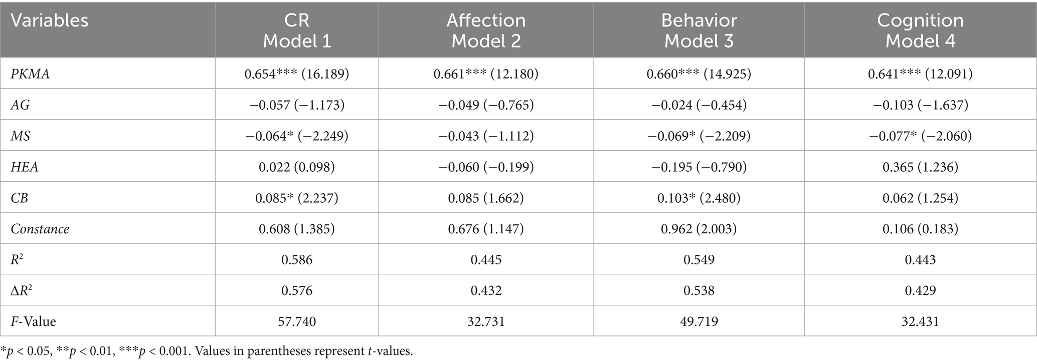 Control Variables: Based on previous research, age (AG), marital status (MS), highest educational attainment (HEA), and career background (CB) were included as control variables. Due to space limitations, abbreviations of variables are used in the following table.
