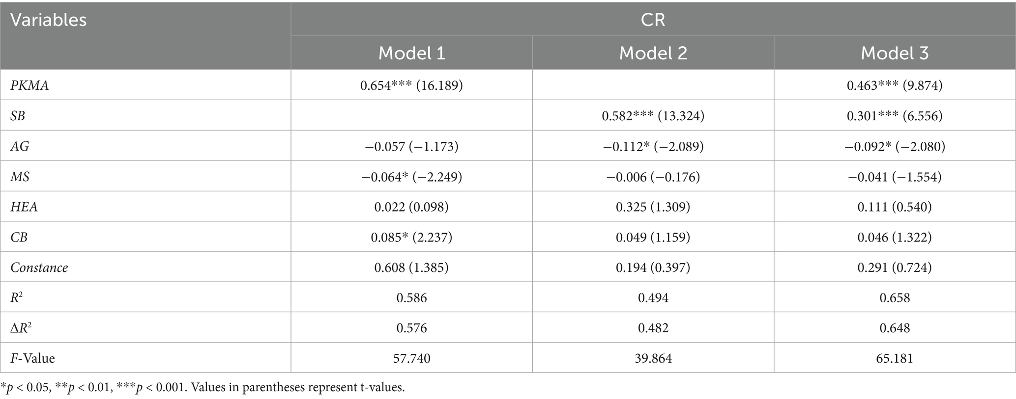 In order to further understand the mechanism of personal knowledge management’s impact on the career resilience of civil aviation pilots, this study draws on the mediation effect testing method proposed by Baron and Kenny (1986), using safety behavior as a mediating variable to construct a mediation model based on the above equation, as shown in Equations 2 and 3:
