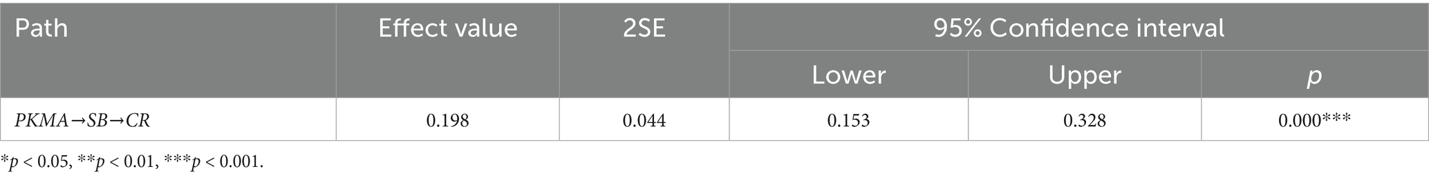Finally, this study further examined the mediating effect of safety behavior using Preacher and Hayes’ (2008) Bootstrap mediation effect test method. The Bootstrap sample size was set to 5,000, with a 95% confidence interval. If the 95% confidence interval did not include 0, it indicated the presence of a mediating effect; if the 95% confidence interval included 0, it indicated the absence of a mediating effect. The results are shown in Table 7. The mediating effect of safety behavior is 0.198, with a 95% confidence interval of [0.153, 0.328], which does not include 0, indicating that the mediating effect of safety behavior is significant. After controlling for the mediating variable, the direct effect of personal knowledge management ability on career resilience is still significant (direct effect = 0.452***, p < 0.001), and the direct effect value of 0.452 is less than the total effect value of 0.651, indicating that safety behavior plays a partial mediating role. The hypothesis is further verified.