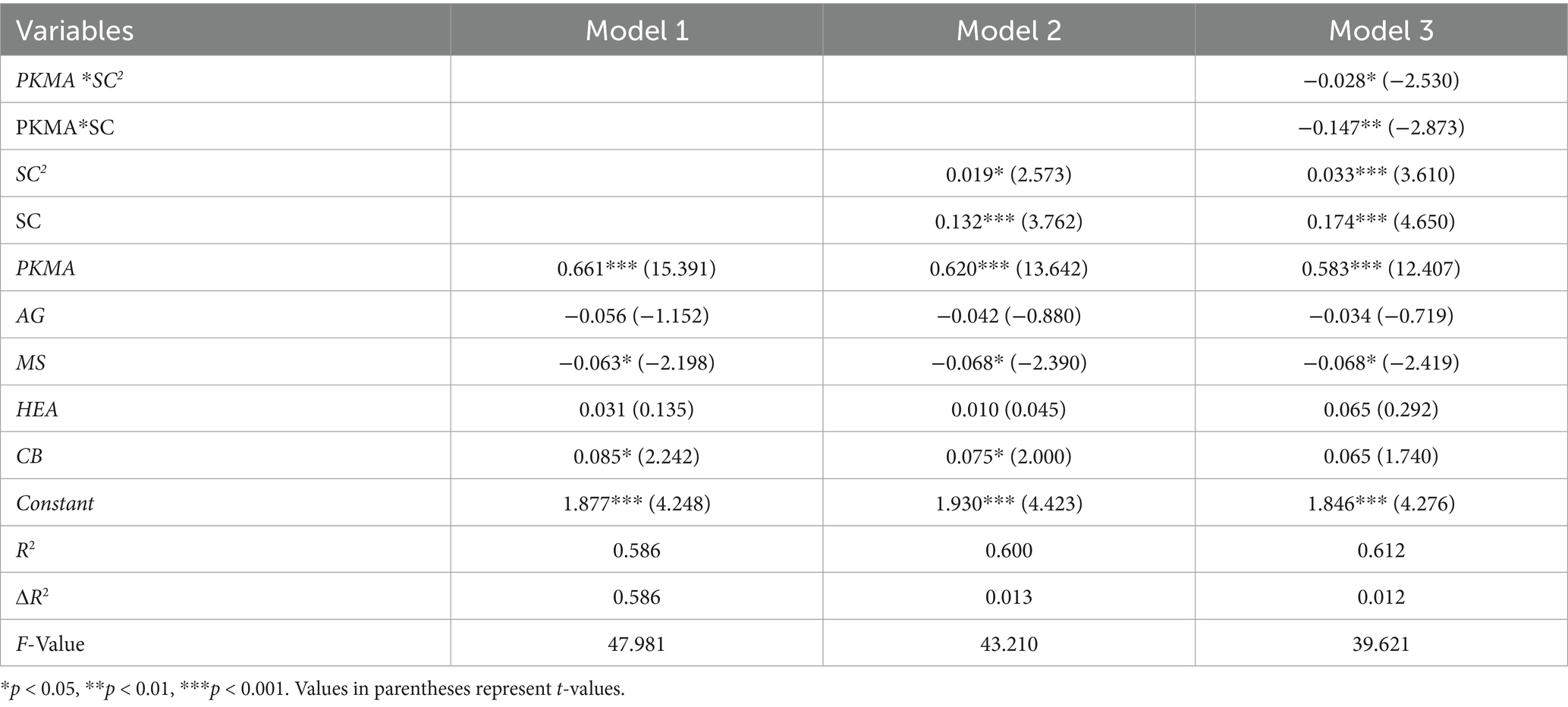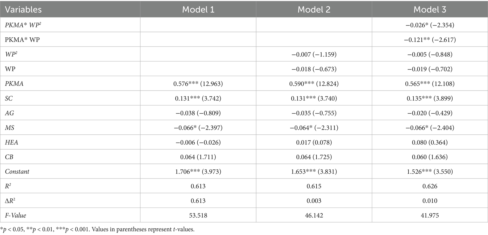 In Equations 2 and 3, “M” is the mediating variable, “ ” is the estimated coefficient corresponding to PKMA, and represents the effect of personal knowledge management ability on the mediating variable; “k2, k3” is the control variable coefficient; “c’” is the estimated coefficient of PKMA after adding the mediating variable; and “b” is the estimated coefficient of the mediating variable.