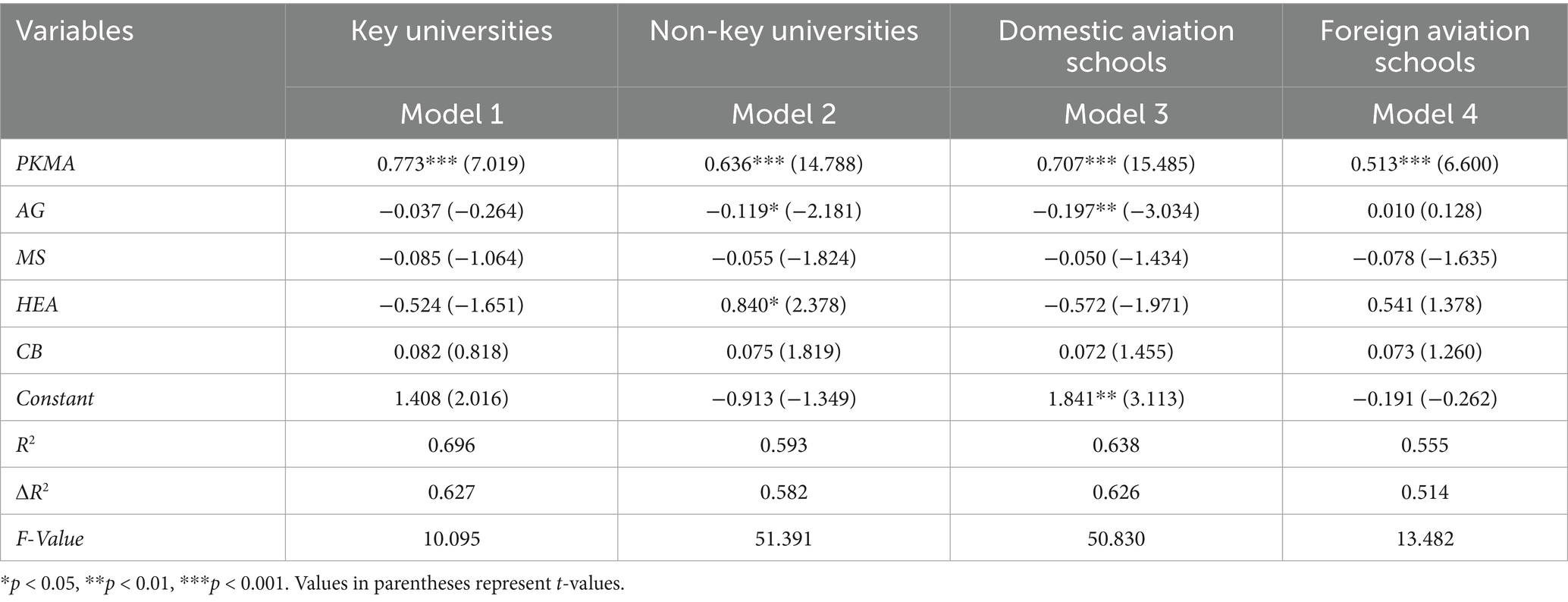 The samples were divided into key universities and non-key universities, and the regression results are shown in Model 1 and Model 2 in Table 10. It can be observed that, compared with non-key universities, the personal knowledge management ability of pilots from key universities has a stronger promoting effect on career resilience. The reason may be as follows: key universities are generally considered to be high-quality resources in China’s higher education system, with significant advantages in terms of teaching staff, teaching facilities, scientific research levels, and academic reputation. In contrast, non-key universities may have certain deficiencies in these areas. According to Conservation of Resources Theory, key universities leverage their superior educational resources to help pilots construct systematic knowledge frameworks, accumulate tacit knowledge, and solidify the resource foundation for personal knowledge management ability. Simultaneously, their vibrant research environments stimulate pilots’ proactive knowledge management awareness, fostering an inertia for resource accumulation. This initial resource advantage reduces resource depletion during knowledge management, enhances resilience in adversity, and accelerates the conversion of personal knowledge management ability into career resilience. Consequently, pilots from key universities demonstrate a stronger promotion of career resilience through their personal knowledge management ability compared to those from non-key universities.