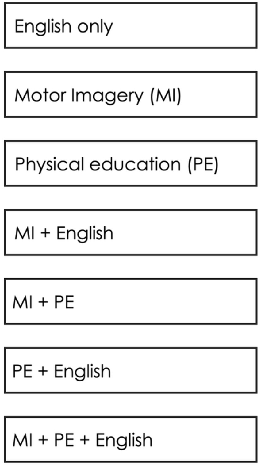 Different class combinations students experienced during 2 weeks. PE, physical education; MI, motor imagery.
