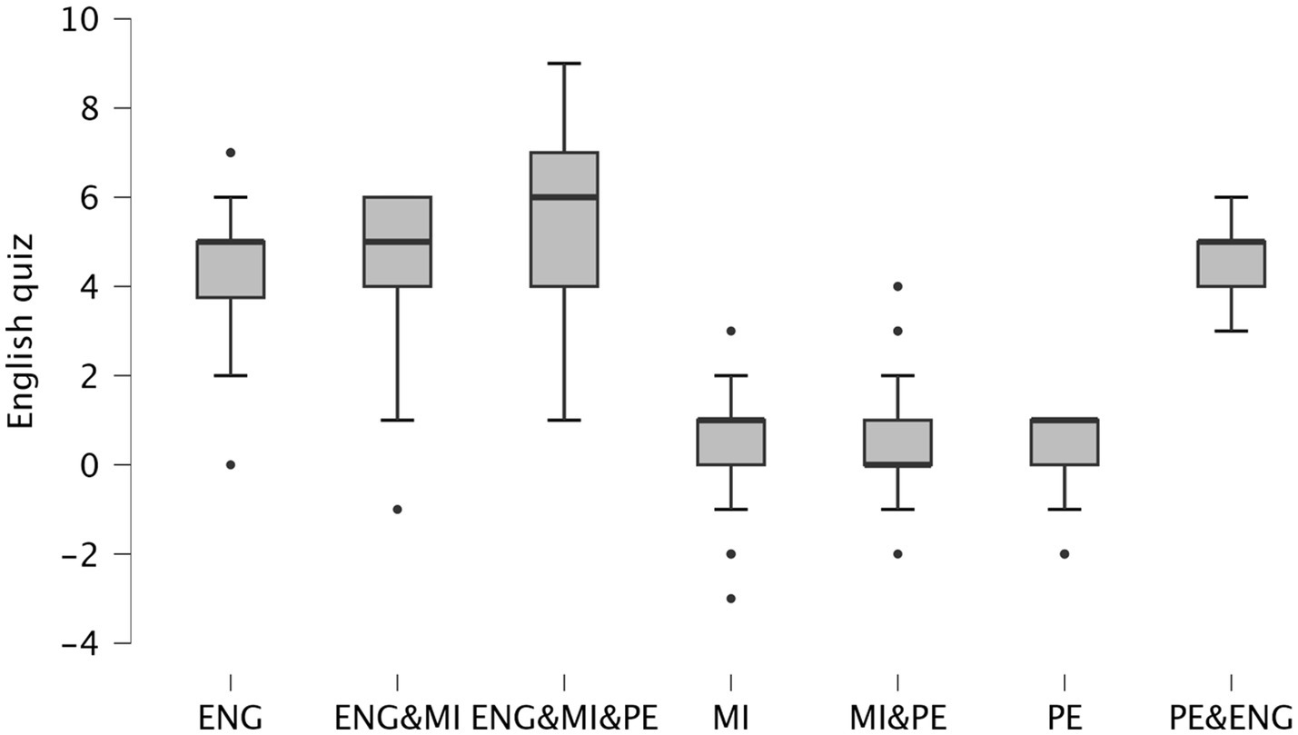 This study investigated the combined impact of PE, MI, and English instruction on vocabulary retention, motor performance, and student enjoyment in junior secondary students. Using a crossover repeated-measures design, 92 students (aged 12–13) participated in seven randomized class sessions incorporating different combinations of PE, MI, and English (alone, in pairs, or all together) over a two-week period. Vocabulary retention was assessed through pre- and post-class English quizzes, motor skill performance was measured using basketball passing accuracy, and enjoyment was evaluated through post-session surveys.