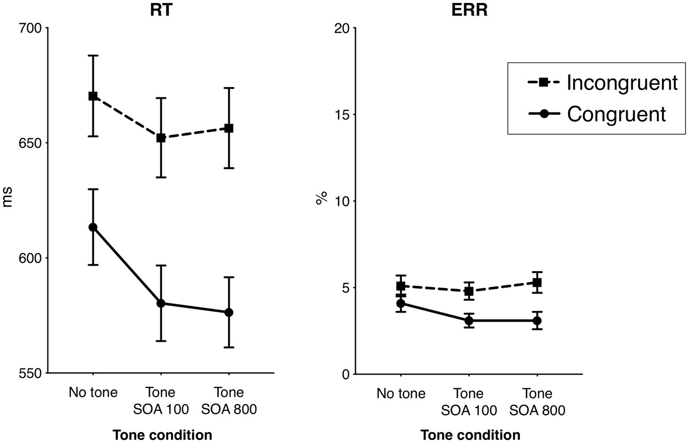 Figure 2. Behavioral results: the effects of flanker congruency and alerting tone on the response times (RT) of correct responses and the error rates (ERR). Vertical bars represent standard errors of the mean.