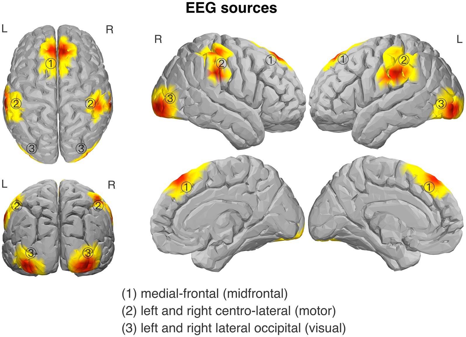By means of the GED-based method of EEG source separation we isolated the three a-priori specified sources: (1) midfrontal, (2) left and right centro-lateral (motor), and (3) left and right lateral occipital (visual). Visualizations of the spatial distributions of the isolated sources are shown in Figure 3. The subsequently estimated source-level time-frequency activity was used to examine local power within the sources and phase coherence-based functional connectivity between the sources.