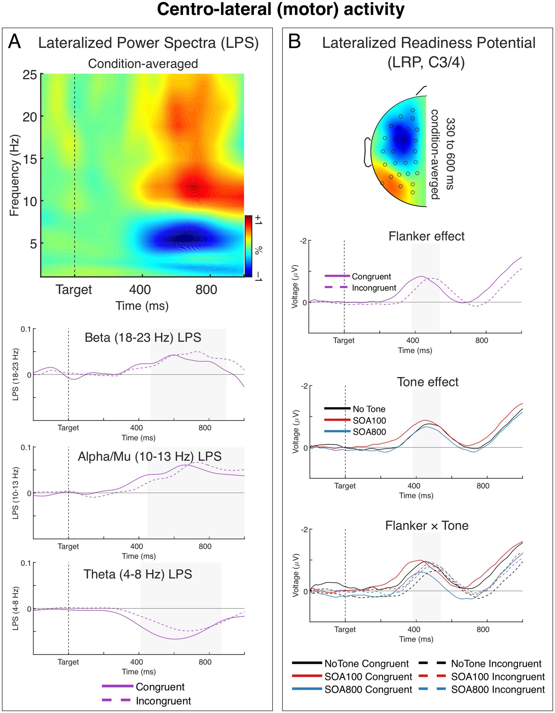 Figure 5. Response-related centro-lateral activity. (A) Lateralized power spectra (LPS) (relative to the responding hand) of stimulus-locked induced power from the centro-lateral (motor) sources. The time-frequency plot shows condition-averaged LPS from the motor sources. The LPS results show a significant transient lateralization of power in the beta (∼18–23 Hz), alpha/mu (∼10–13 Hz), and theta (∼4–8 Hz) bands, indicating that contralateral beta and mu power was smaller than ipsilateral power, and contralateral theta power was larger than ipsilateral theta power. The charts below show LPS in the beta, alpha/mu, and theta bands over time for the two flanker conditions. Tone effects are not shown in the figure, as no significant effects of tone were observed. (B) Stimulus-locked lateralized readiness potential (LRP) recorded over the motor cortex (the C3/4 sites). The head map show topography of condition-averaged LRP. The topographic map was obtained by subtracting all the symmetrical electrodes (contra–ipsilateral) and plotted the difference on the left hemisphere. The map is min–max scaled, with positive polarity in red and negative polarity in blue. The head view is from above. The charts below show the LRPs separately as a function of flanker congruency, alerting tone, and Flanker × Tone interaction. All three effects were significant in the stimulus-locked LRPs. Negative voltage (plotted upward) represents activation of the correct response (contralateral to the responding hand).