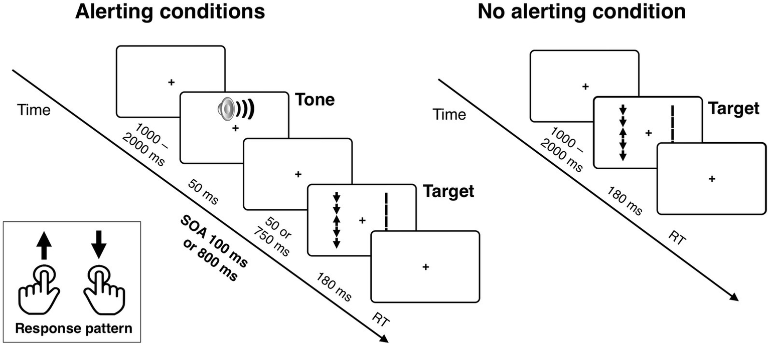 A large number of studies have shown improvements in behavioral performance when a short-lived phasic alerting was induced by presenting a visual or auditory accessory stimulus within about 500 ms before the onset of a target stimulus (for a review see, e.g., Hackley, 2009; Posner, 2008; Poth, 2025). The improvement is usually reflected in faster response times (RT). Electrophysiological and imaging studies have demonstrated that this behavioral enhancement is produced by increasing the speed of processing and/or lowering the “decision threshold” at several stages of the sensorimotor pathway, from the initial perceptual processing and stimulus discrimination (Böckler et al., 2011; Fischer et al., 2012; Kusnir et al., 2011; Petersen et al., 2017; Wiegand et al., 2017) to decision making and early phases of response selection and activation (Böckler et al., 2011; Hackley and Valle-Inclán, 1998, 1999; Hackley et al., 2009; Yanaka et al., 2010; Yoshida et al., 2013). Imaging studies have also showed that the alerting process relies on activation of a distributed network of anterior, posterior, and subcortical areas characterized as an alerting network (Fan et al., 2005; Sadaghiani and D'Esposito, 2015; Xuan et al., 2016; for a review see, e.g., Posner and Rothbart, 2007; Petersen and Posner, 2012).