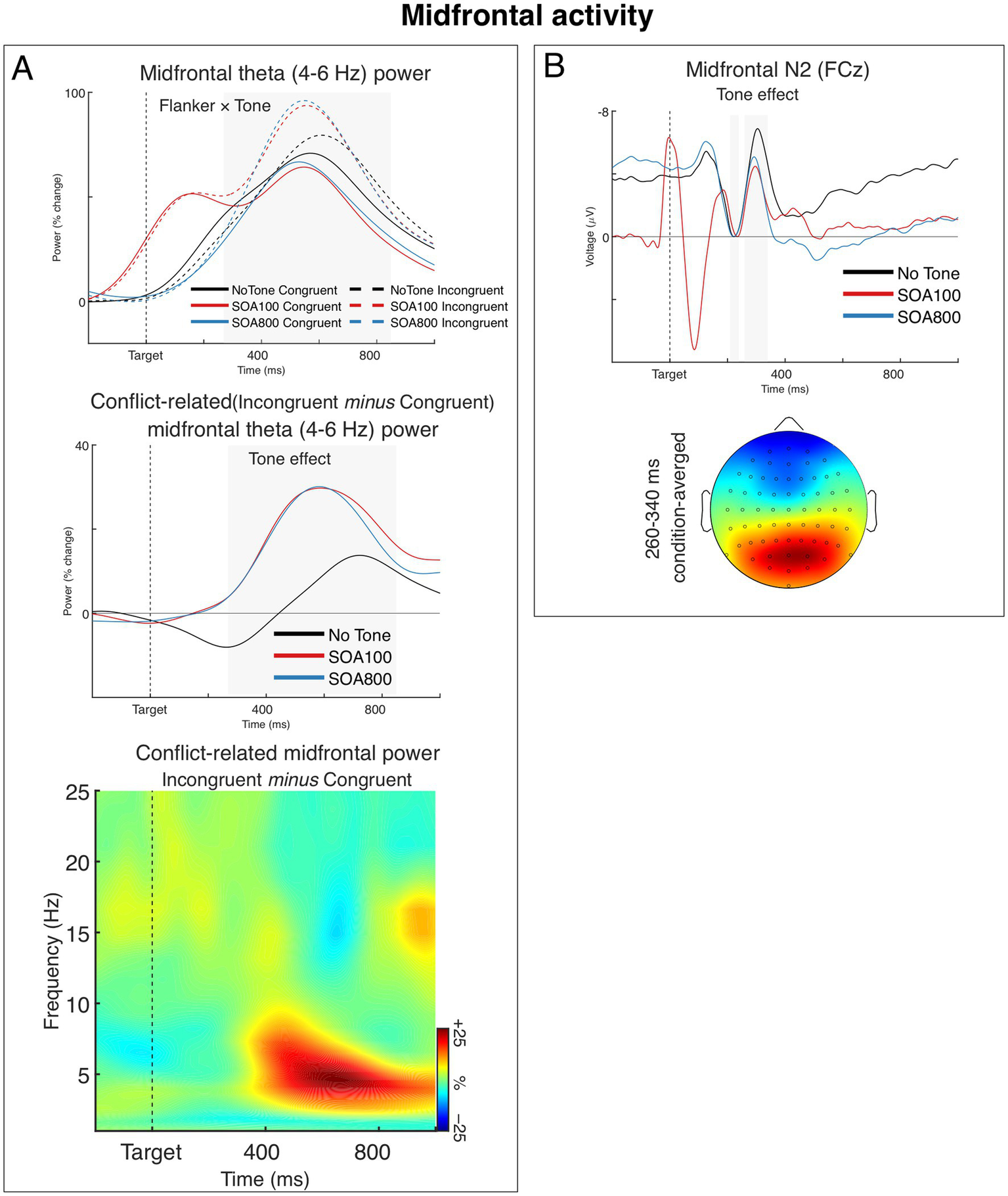 Figure 4. Midfrontal (medial frontal) activity. (A) Post-target modulations of induced (non-phase-locked) theta power from the midfrontal source. The upper chart shows grand averages of theta power over time for each task condition. The chart shows that alerting tone modulated theta power predominantly in the incongruent flanker condition. Note that the early peak in the SOA 100 condition (red lines) is an effect of the tone presented 100 ms before target onset. The grey-shaded area marks the analyzed time window. The middle chart shows grand averages of the incongruent–congruent differences in midfrontal theta power, illustrating the alerting effect on the conflict-related theta. The time-frequency plot at the bottom shows the spectra of the incongruent-congruent difference in midfrontal power (i.e., conflict-related theta) averaged across the three Tone conditions. (B) The Tone effect on the N2 component of the ERP and condition-averaged topography of the N2. Negative voltage points upwards. The N2 amplitude was measured relative to the preceding P2 (instead of the prestimulus baseline, which was affected by Tone condition). To show the N2-to-P2 amplitude differences, we present the waveforms aligned (baselined) to the P2 epoch, so that the mean P2 amplitudes (210–240 ms) are at zero and the negative values of the N2 peaks show the actual N2–P2 amplitude differences. The gray areas indicate the time windows within the P2 and N2 mean amplitudes were measured. The head map is min–max scaled, with positive polarity in red, negative polarity in blue.
