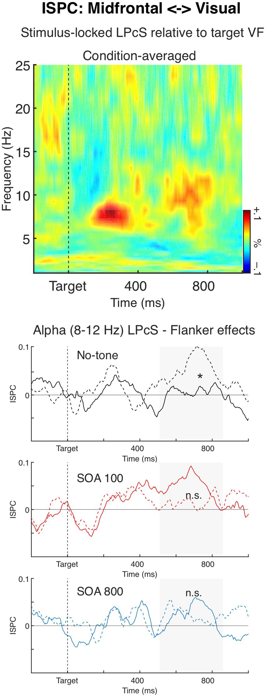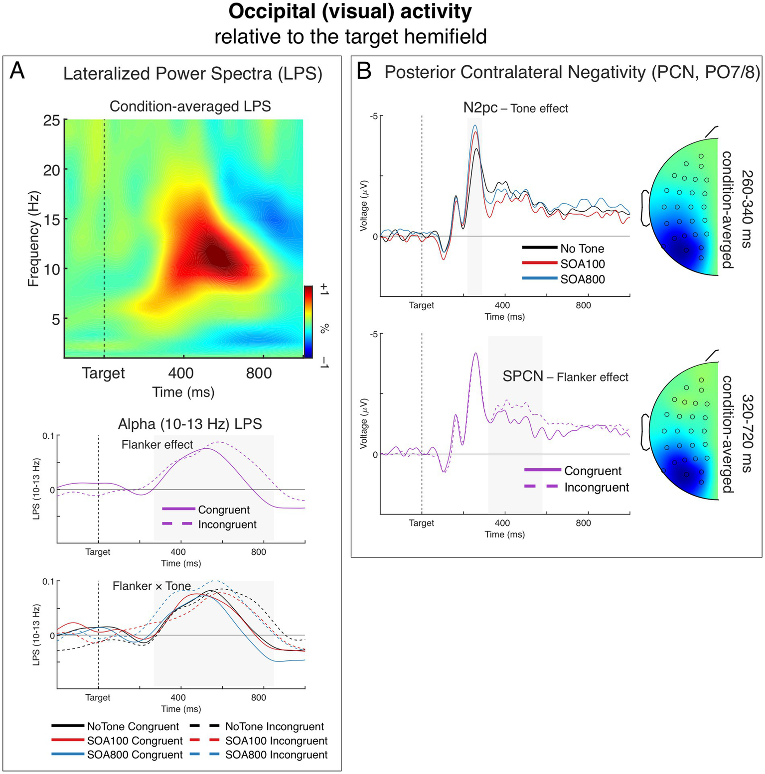 Figure 6. Lateralized occipital (visual) activity, relative to the target visual hemifield. (A) Lateralized power spectra (LPS) of stimulus-locked induced power from the occipital sources. The time-frequency plot depicts condition-averaged LPS. The LPS result shows a significant transient lateralization of power in the alpha-band (∼10–13 Hz) indicating that contralateral alpha power was smaller than ipsilateral alpha power. The charts below show this alpha-band LPS over time separately for the main effect of Flanker (middle) and the Flanker × Tone interaction (bottom). (B) The posterior contralateral negativity (PCN) of the ERP. Negative voltage is plotted upward. The upper chart depicts the effect of Tone on the N2pc component (marked by the grey-shaded area). The head map shows topography of condition-averaged N2pc. The bottom chart depicts the effect of Flanker on the SPCN component (marked by the grey-shaded area). The head map shows topography of condition-averaged SPCN. The topographic maps were obtained by subtracting all the symmetrical electrodes (contra–ipsilateral) and plotted the difference on the left hemisphere. The maps are min–max scaled, with positive polarity in red and negative polarity in blue. The head view is from above.