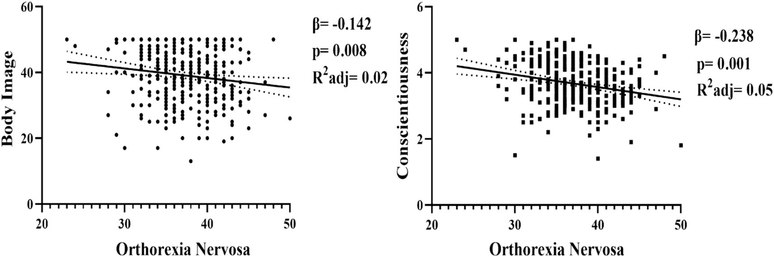 The simple linear regression analysis conducted on the prediction of orthorexia nervosa in Figure 3 revealed that conscientiousness (β = −0.238; t = −4.563; p = 0.000) among personality traits has a significant negative predictive power on orthorexia nervosa. It can be stated that 5% of the variance in orthorexia nervosa is explained by conscientiousness. Another regression result showed that body image (β = −0.142; t = −2.675; p = 0.008) has a negative and significant predictive power on orthorexia nervosa. It can be stated that 2% of the variance in orthorexia nervosa is explained by body image.