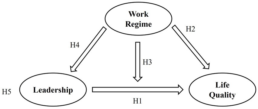 The literature review conducted above leads us to test the association between leadership and quality of life and whether the work regime moderates this relationship. It also leads us to examine the association between the work regime and quality of life and whether this relationship is mediated by leadership.