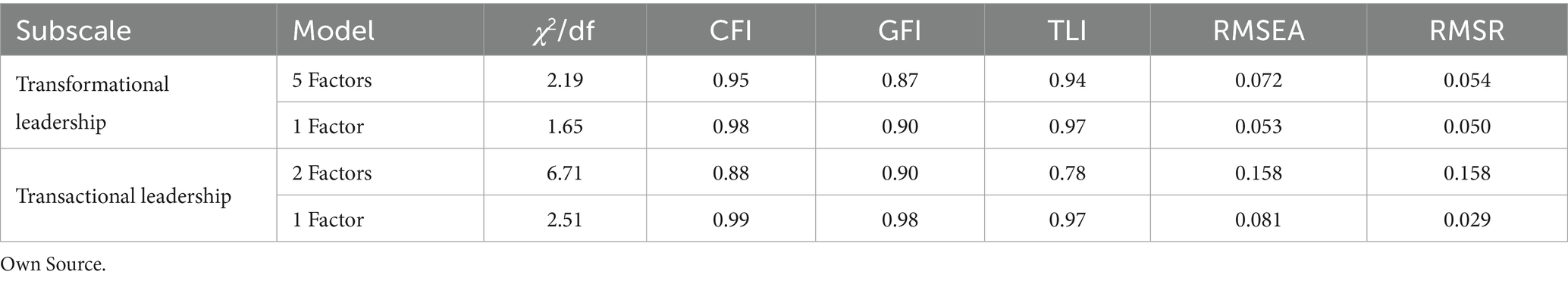 To test the validity of the transformational leadership subscale, a confirmatory factor analysis with five factors was initially performed. Although the fit indices were adequate or very close to adequate values, the factors were strongly correlated (Table 1). A new confirmatory factor analysis with one factor was performed, and adequate fit indices were obtained. Due to these results, in this study, we will consider this instrument as unidimensional (Table 1). Transformational leadership exhibits a composite reliability of 0.96 and an average value of 0.57, indicating good composite reliability and convergent validity. In terms of internal consistency, it has a Cronbach’s alpha of 0.96, which can be considered excellent (Marôco and Garcia-Marques, 2006).