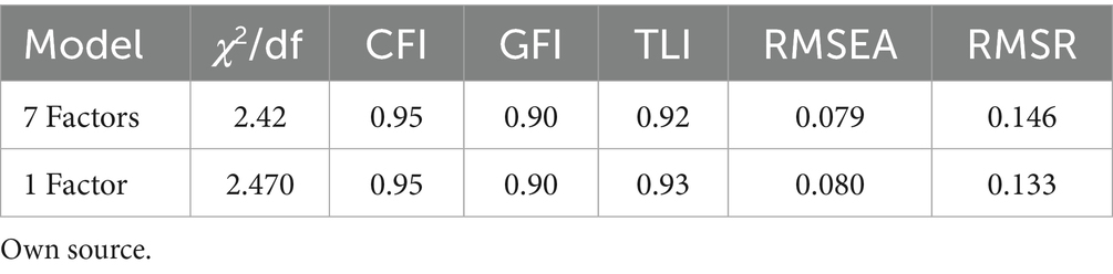 The validity of the instruments was tested using confirmatory factor analysis in AMOS Graphics 29 software. The procedure followed a “model generation” logic (Jöreskog and Sörbom, 1993). Six fit indices were combined, as recommended by Hu and Hu and Bentler (1999). The fit indices calculated were as follows: chi-square ratio/degrees of freedom (χ2/gl); Tucker-Lewis Index (TLI); goodness of fit index (GFI); comparative fit index (CFI); root mean square error of approximation (RMSEA); root mean square residual (RMSR). The chi-square/degrees of freedom ratio (χ2/gl) must be less than 5. The CFI, GFI, and TLI values must be equal to or greater than 0.90. For RMSEA to be considered a good fit, its value must be less than 0.08 (MacCallum et al., 1996). The lower the RMSR value, the better the fit (Hu & Hu and Bentler, 1999). With the data obtained from the confirmatory factor analysis, the reliability construct for each dimension and the convergent validity (as calculated by the AVE value) were assessed. The construct reliability values should be higher than 0.70, and the AVE value should be equal to or higher than 0.50 (Fornell and Larcker, 1981). However, values between 0.40 and 0.50 can be accepted if the Cronbach’s alpha value exceeds 0.70 (Hair et al., 2011). Divergent validity was also calculated.