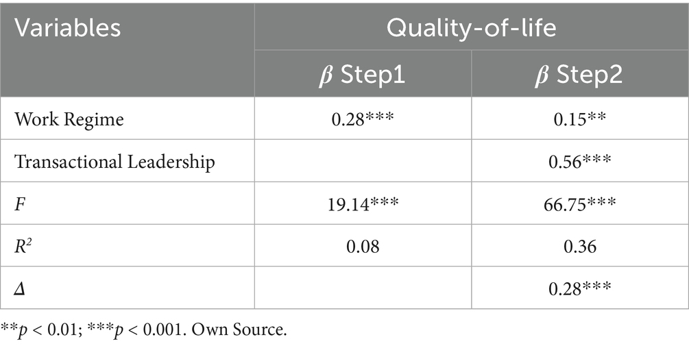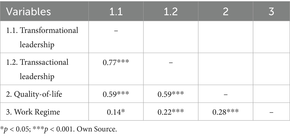 The association between quality of life and transformational leadership has the same strength as the association between quality of life and transactional leadership (Table 4). Regarding the work regime, the strongest association is with quality of life and the weakest with transformational leadership (Table 4).