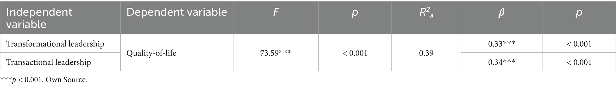 Both transformational leadership (β = 0.33, p < 0.001) and transactional leadership (β = 0.34, p < 0.001) have a positive and significant association with quality of life (Table 5). The model explains 39% of the variability in quality of life (Table 5). The model is statistically significant [F(2, 228) = 73.59, p < 0.001] (Table 5).