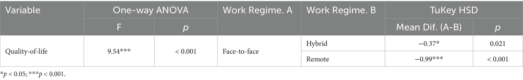 The work regime has a significant effect on quality of life [F(2, 228) = 9.54; p < 0.001] (Table 6). The quality of life for participants working in person differs significantly from that of participants working remotely or in a hybrid work regime (Table 6).