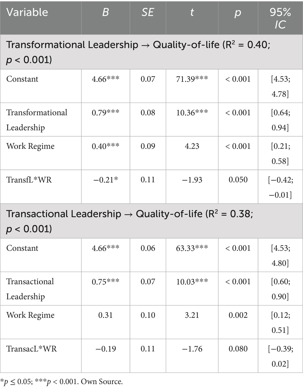 Hypothesis 3: The work regime moderates the relationship between leadership and quality of life.