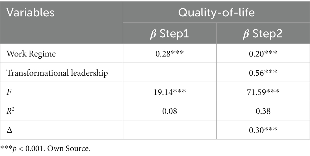 Results: Leadership has a positive and significant association with the perception of quality-of-life. The work regime has a significant effect on the perception of quality-of-life and moderates the relationship between transformational leadership and the perception of quality-of-life. The work regime has a significant impact on the perception of leadership. Leadership has a mediating effect on the relationship between the work regime and the perception of quality of life.