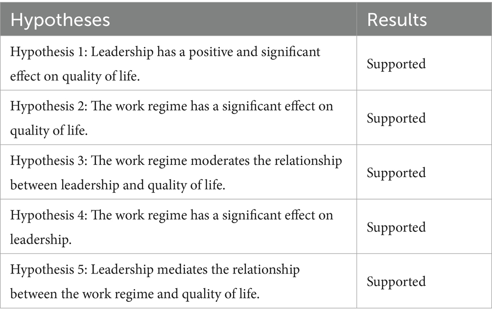 Hypothesis 5: Leadership mediates the relationship between the work regime and quality of life.