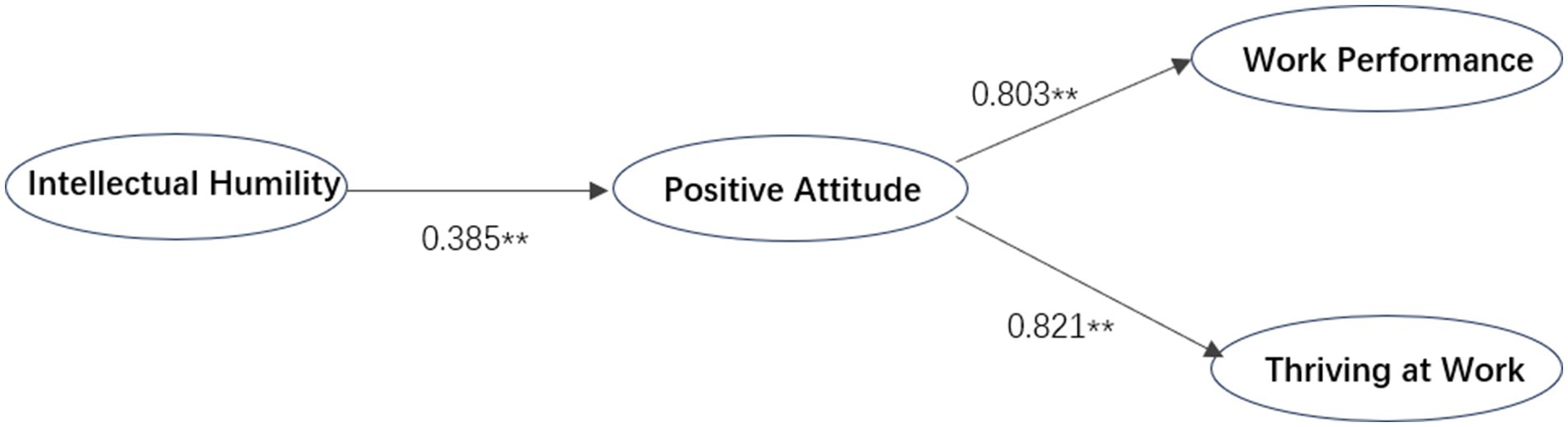 Positive work attitudes had a significant effect on the relationship between intellectual humility leadership and job performance (β = 0.163, p < 0.01), as well as between intellectual humility leadership and thriving at work (β = 0.193, p < 0.01), providing preliminary evidence for the mediating role of positive work attitudes. With 2,000 bootstrap samples, the 95% confidence intervals were [0.106, 0.208] and [0.126, 0.231], respectively, both excluding zero, thereby further confirming the significant mediating effect of positive work attitudes. Therefore, Hypotheses 5 (H5) and 7 (H7) were supported. The results of the theoretical model are shown in Figure 2.
