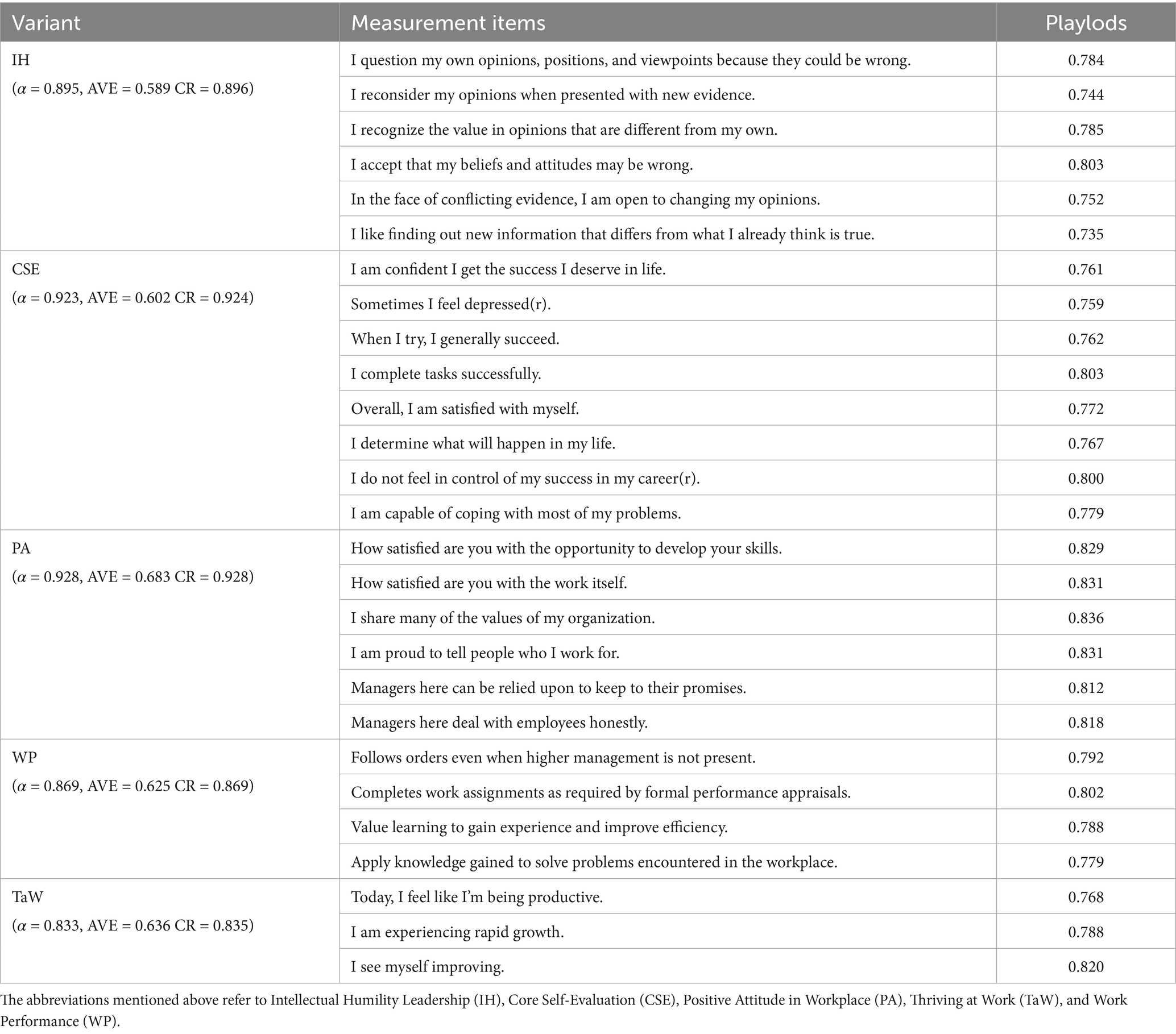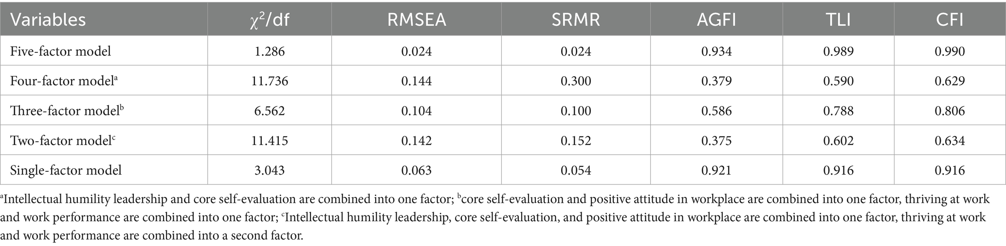 In testing the mediation model, this study adopted structural equation modeling (SEM) to examine the indirect effects among the variables. Compared the theoretical model, nested models, and alternative models to identify the best-fit model. Prior to analysis using AMOS 28 software, we conducted parceling of measurement items through a balanced method due to the large number of measurement items; this step resulted in each variable containing 3 items (Wu and Wen, 2011). The theoretical model assumes no direct effect of intellectual humility leadership on work performance and thriving at work among new generation employees; the nested model adds direct effects based on the theoretical model; the alternative model assumes no mediating effect, with intellectual humility leadership, core self-evaluation, and positive attitude in workplace directly influencing work performance and thriving at work among new generation employees.