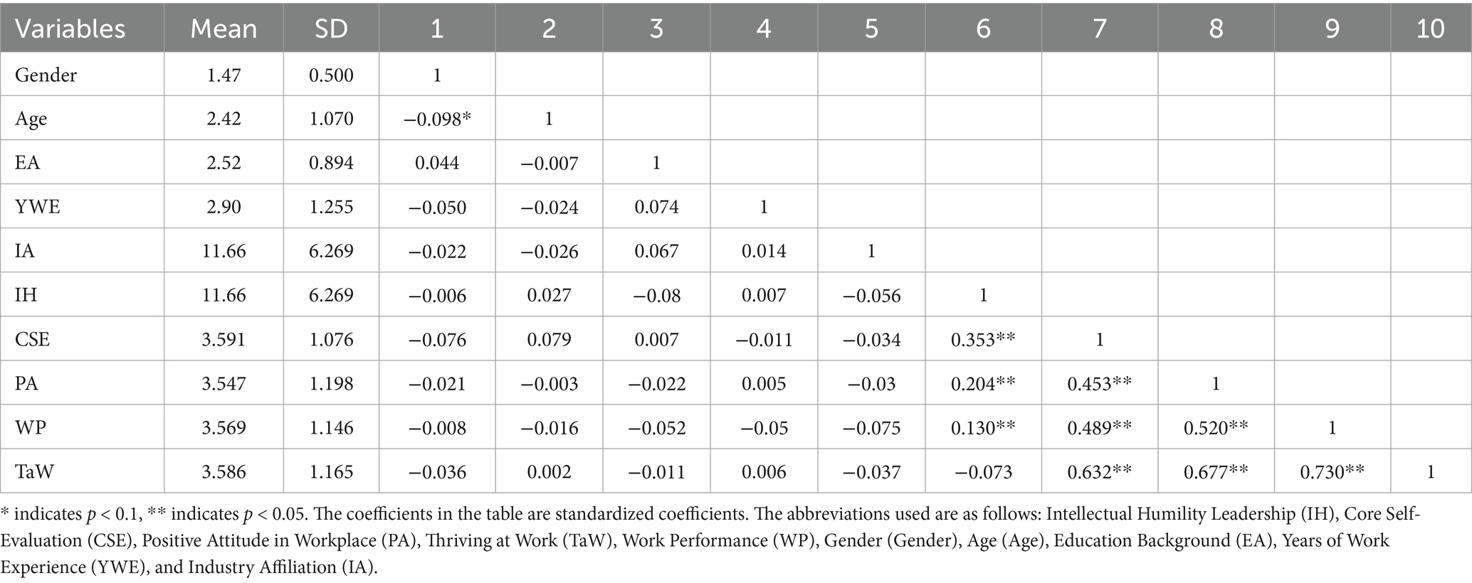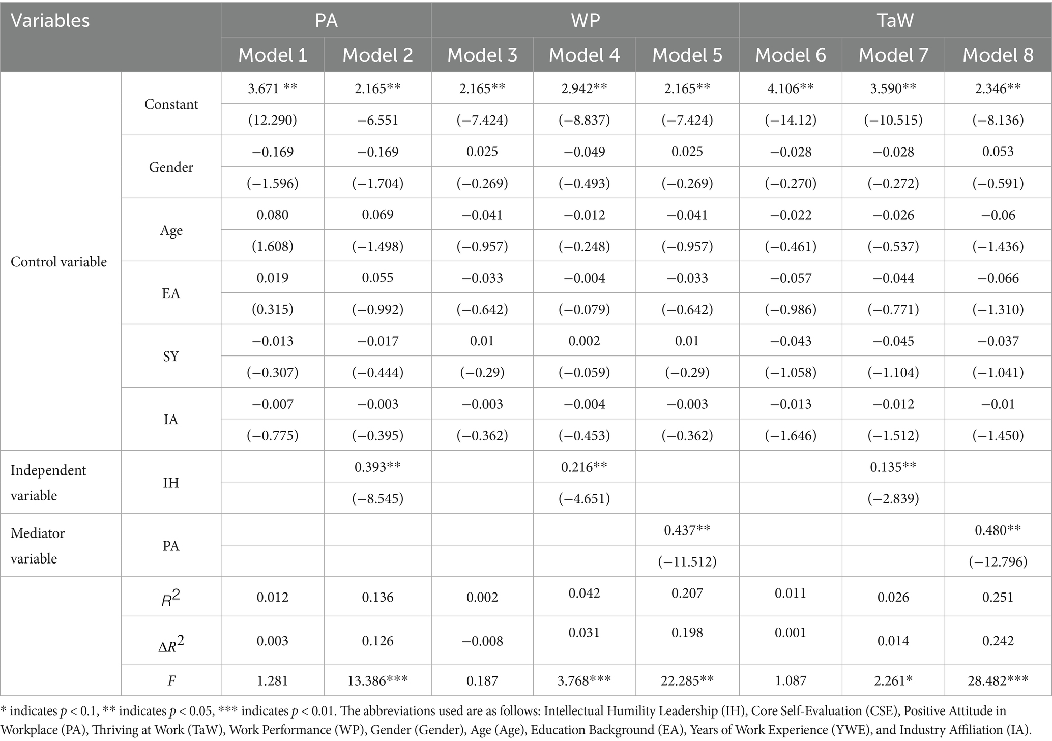 The descriptive statistics and correlation coefficients among variables are presented in Table 3. According to Table 3, Intellectual humility leadership is significantly positively correlated with positively attitude in workplace among new generation employees (r = 0.353, p < 0.05), work performance (r = 0.204, p < 0.05), and thriving at work (r = 0.130, p < 0.05). Core self-evaluation among new generation employees is significantly positively correlated with positive attitude in workplace (r = 0.632, p < 0.05), work performance (r = 0.677, p < 0.05), and thriving at work (r = 0.730, p < 0.05). Positive attitude in workplace among new generation employees is significantly positively correlated with work performance (r = 0.453, p < 0.05) and thriving at work (r = 0.489, p < 0.05). Work performance among new generation employees is significantly positively correlated with thriving at work (r = 0.520, p < 0.05). There are significant pairwise correlations among the main variables, indicating suitability for regression analysis.