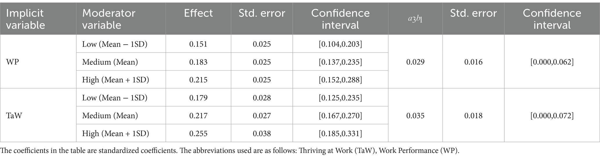 First, according to the Job Demands–Resources (JD-R) theory, CSE, as a stable personal resource, determines the extent to which employees can effectively utilize the job resources provided by leaders (Tummers and Bakker, 2021). Employees with high CSE, due to their abundant personal resources, are better able to mobilize and integrate leaders’ support and autonomy, and thus, through positive attitudes, demonstrate higher levels of thriving at work. In contrast, employees with low CSE, owing to weaker confidence and a limited sense of control, have constrained capacity to mobilize resources, leading to a weaker mediating effect. Nevertheless, because IH leadership fosters psychological safety, respects individual differences, and encourages voice, employees with low CSE can still gradually develop positive attitudes, which in turn promote growth and performance. This finding resonates with Judge and Bono (2001), who noted that CSE significantly shapes how individuals perceive and utilize their organizational environment.