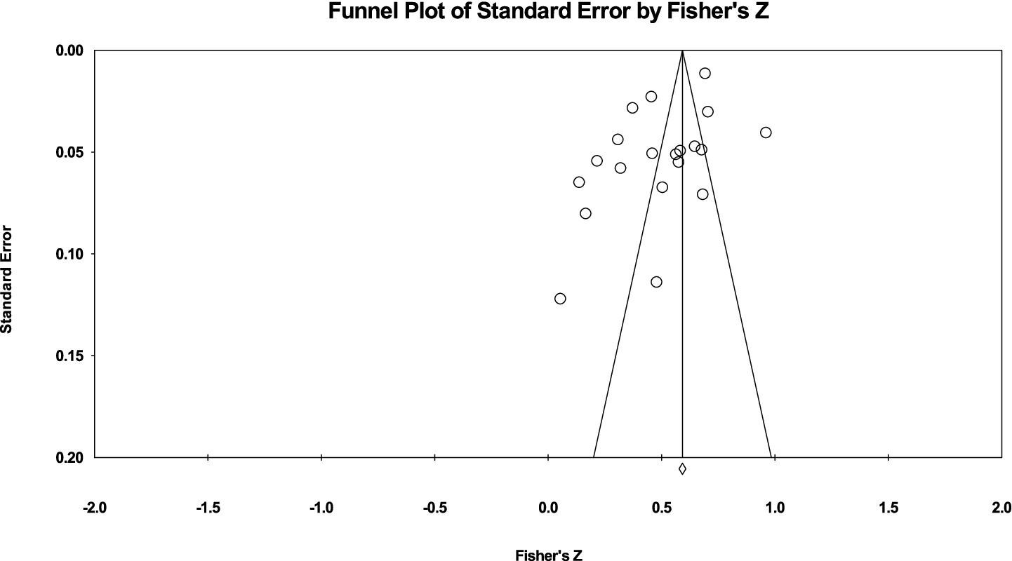 This study used forest plots to show the effect sizes and confidence intervals for each included study. Funnel plots were also created to check for potential publication bias. To further assess publication bias, the Classic Fail-safe N method was applied. Statistical heterogeneity was examined using Cochran’s Q test and the I2 statistic. A significant p-value from the Q test (p < 0.05) suggested that heterogeneity was present. Based on the guidelines by Higgins et al. (2003), I2 values of 25, 50, and 75% indicated low, moderate, and high heterogeneity, respectively. To better understand the sources of heterogeneity, subgroup analyses and meta-regression were conducted. These analyses were based on pre-defined moderator variables, including sex ratio, cultural background, and the type of questionnaire used to measure the outcome variable.