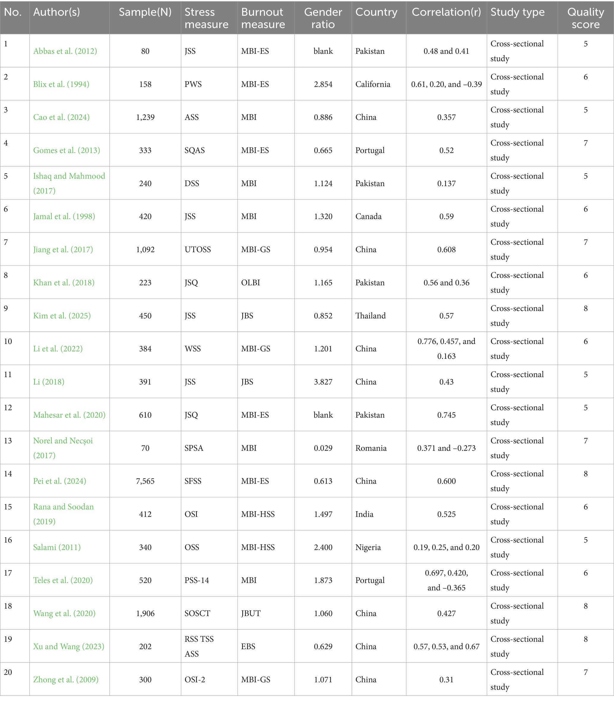 In recent years, JBI has been widely used in the quality control stage of systematic reviews and meta-analyses (Hou et al., 2017), and is considered to be superior to the traditional NOS in the adaptability of cross-sectional studies (Xu et al., 2022; Barker et al., 2025). Since the 20 included studies were all cross-sectional studies, the JBI Critical Appraisal Checklist for Analytical Cross-Sectional Studies was used for quality assessment. Two reviewers independently scored each article according to the 8 criteria of the scale. Before the formal evaluation, the reviewers conducted trial scoring on some of the articles to ensure consistent understanding. Each item was scored according to “yes,” “no,” “unclear” or “not applicable.” In all studies, the two reviewers scored completely consistently, without the intervention of a third party. Given the complete consistency of the scores, consistency indicators (such as the Kappa coefficient) were not calculated. The final total score (0–8 points) was used to classify the literature into high quality (6–8 points), medium quality (3–5 points), and low quality (0–2 points) (Moola et al., 2017). Of the 20 studies included in this meta-analysis, 6 were rated as moderate quality by two independent reviewers, and 14 were rated as high quality. Overall, the quality of all included studies was moderate to high, providing a solid basis for this analysis.