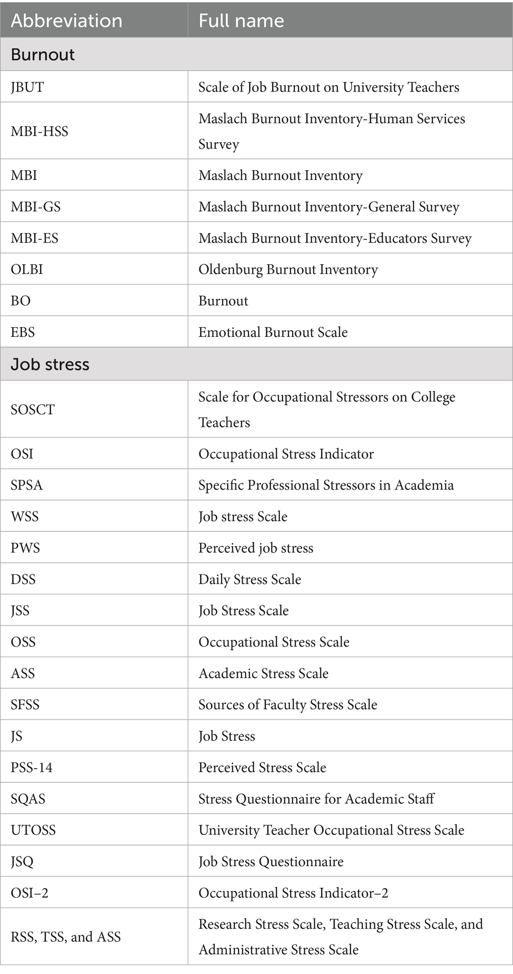 • Terms: ((“job stress” OR “occupational stress”) AND (“burnout” OR “job burnout” OR “occupational burnout”) AND (“lecturer*” OR “faculty” OR “university teacher*” OR “academic staff” OR “college instructor*”)).
