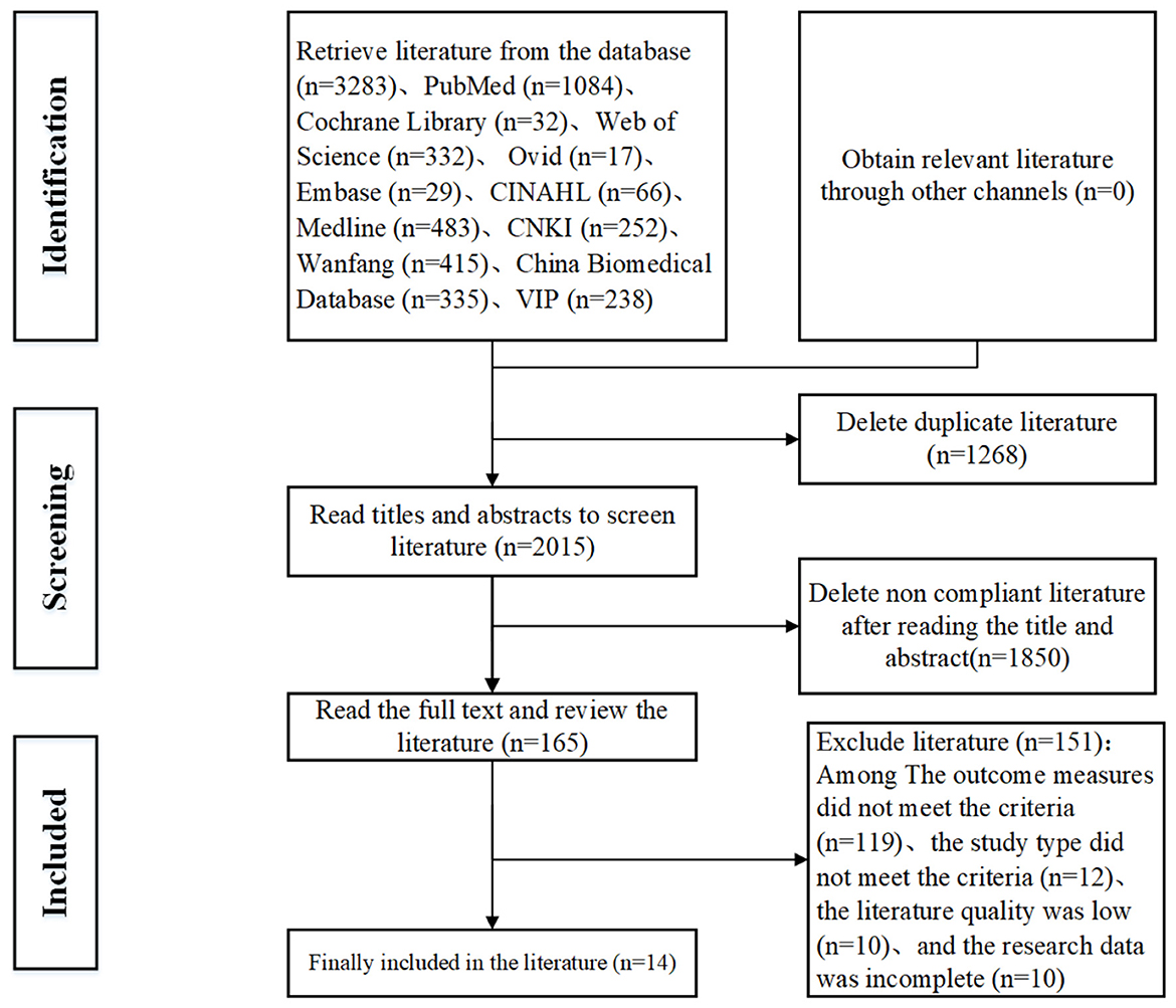 A total of 3,283 records were identified through database searches. After removing 1,268 duplicates, 1,850 records were excluded during title/abstract screening. Full-text review of the remaining 165 articles excluded 151 studies failing to meet inclusion criteria, yielding 14 studies for final inclusion (Figure 1).