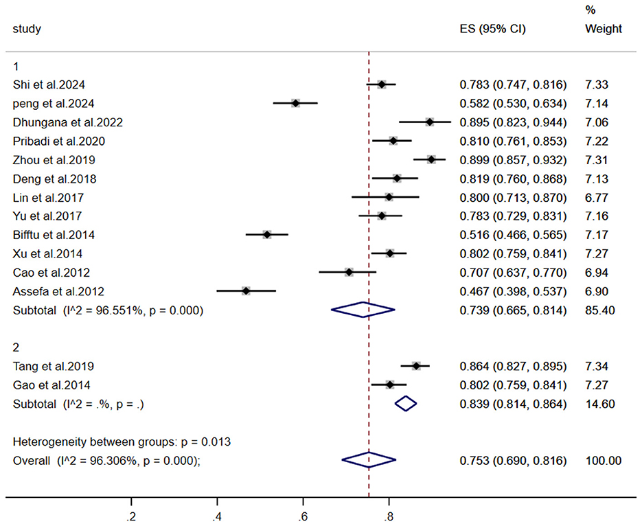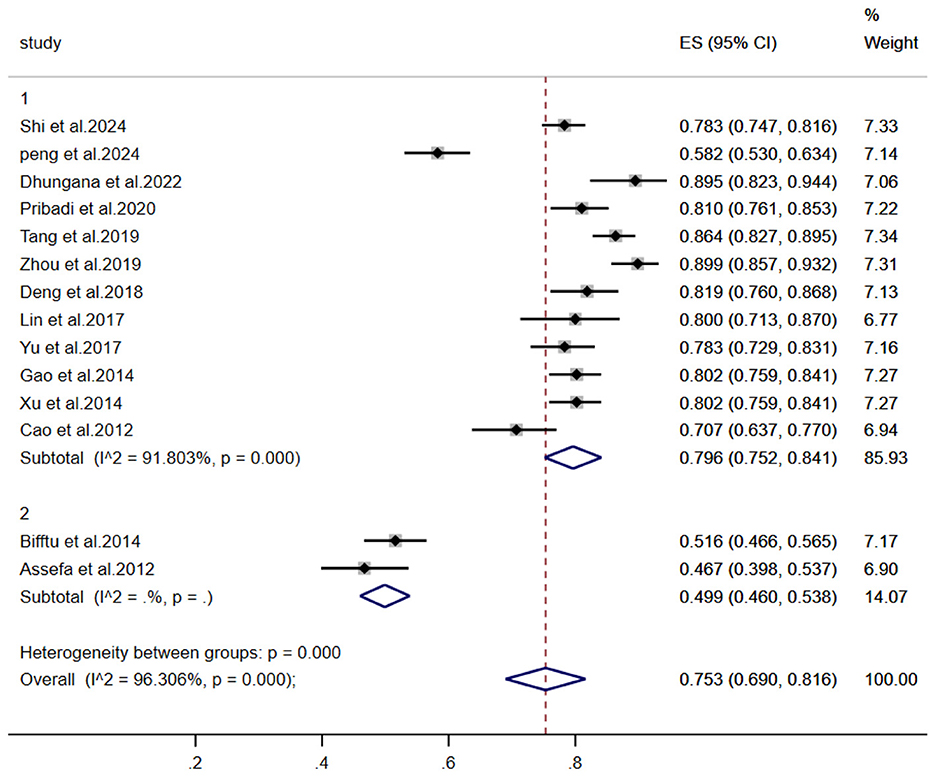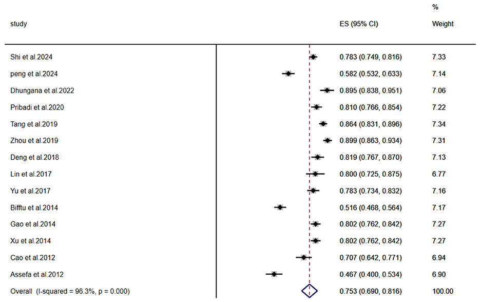 A meta-analysis of stigma prevalence among individuals with schizophrenia included 14 studies (n = 1,872). Significant heterogeneity was observed (I2 = 96.3%, P < 0.001), necessitating a random-effects model. The pooled prevalence was 75.3% (95% CI: 69.0–81.6%), as shown in Figure 2.
