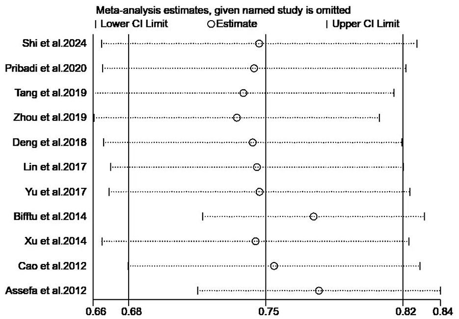 Sensitivity analysis employing the leave-one-out method confirmed the stability of findings: pooled effect sizes under the random-effects model remained consistent with original estimates (Figure 3).