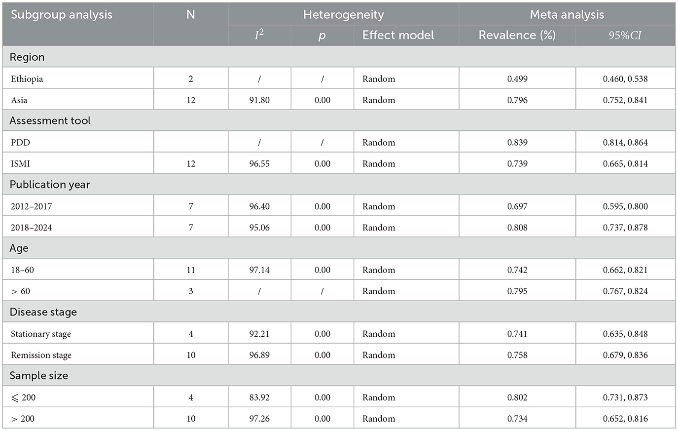 Conclusion: The prevalence of stigma among individuals with schizophrenia is substantial and influenced by region, assessment instruments, age, stage of illness, and sample size. The subgroup analysis indicated a higher prevalence of stigma associated with the following factors: studies conducted in Asia, the use of the PPD scale, publication after 2018, participants aged > 60 years, Sample size: ≤ 200 cases and patients in the remission stage. Future efforts should prioritize developing culturally adapted interventions specifically aimed at reducing stigma, enhancing social functioning, and improving patients' quality of life.