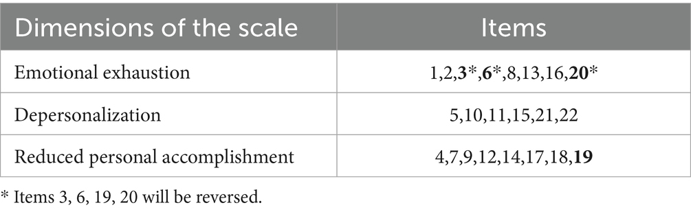 Maslach and Jackson (1981) developed the Maslach Burnout Inventory (MBI) that comprised 22 items on three sub-dimensions: emotional exhaustion, depersonalization and reduced personal accomplishment (eight items). Responses were rated on a 5-point Likert Scale that ranged from 0 = “Never,” 1 = “Rarely,” 2 = “Sometimes,” 3 = “Often,” 4 = “Very Often.” Table 1 presents the details of the sub-dimensions and items.