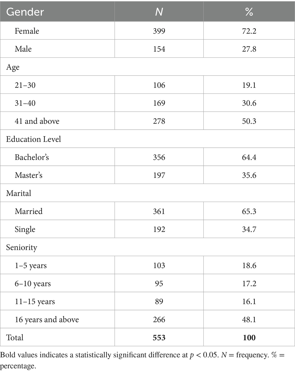 Table 3 presents the participants’ socio-demographic profile. The first five items of the questionnaire asked for “Socio-demographic Data,” which included gender, age, academic background, marital status, and seniority, respectively. Of the respondents, 72.7% were female and 27.8% were male, as shown in Table 1. Regarding age distribution, most respondents (50.3%) were at least 41 years old, while 19.10% were aged 21–30 years. Furthermore, 35.6 and 64.4% had a Master’s and Bachelor’s degree, respectively. In addition, 65.3% were married and 34.7% were single. Of the respondents, 18.6, 17.2, 16.1, and 48.1% had 1–5, 6–10, 11–15, and a minimum 16 years of experience in teaching profession, respectively.