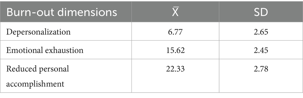 Table 4 summarizes the mean burnout scores. Participants experienced intense burnout in the dimension of reduced personal accomplishment (X̅=22.53, SD = 2.78).