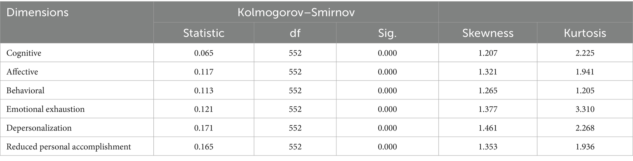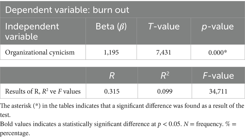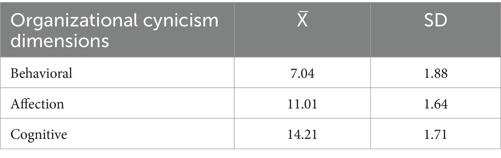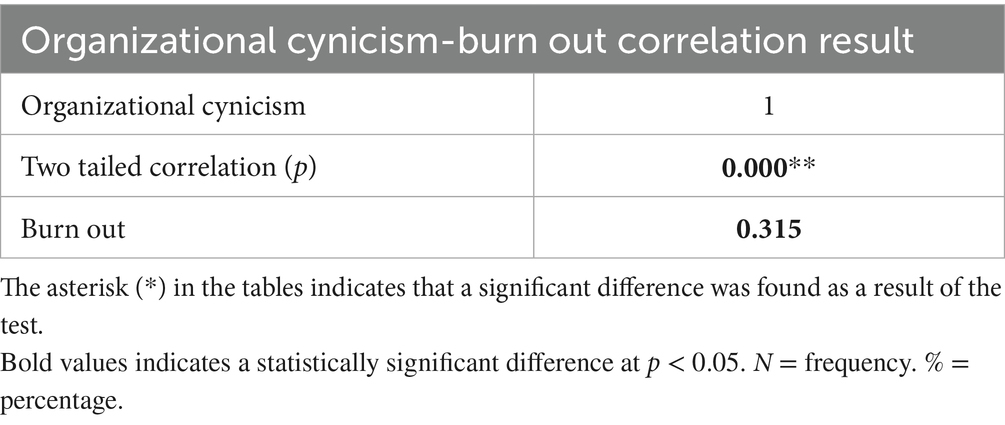 Numerous studies, both nationally and internationally (Acar and Çoğaltay, 2021; Adıgüzel, 2016; Allahkerim, 2020; Demirel and Cephe, 2015; Hatoka et al., 2023; Jamaludin and You, 2019; Özgül and Polat, 2018; Özgül and Atan, 2016; Sadeghi and Kezrlou, 2016; Shaheen and Mahmood, 2016), have aimed to explore educators’ level of burnout based on socio-demographic variables. Furthermore, several studies have explored teachers’ attitudes towards organizational cynicism (Abdurrezzak et al., 2023; Aksu et al., 2024; Gedik and Üstüner, 2019; Kalağan and Güzeller, 2010; Vatansever-Bayraktar and Mutlu, 2023) via demographic variables. However, limited correlational studies have examined the relationship between teachers’ burnout and organizational cynicism (Akan and Yarım, 2019; Amasralı and Aslan, 2017; Duman et al., 2020).