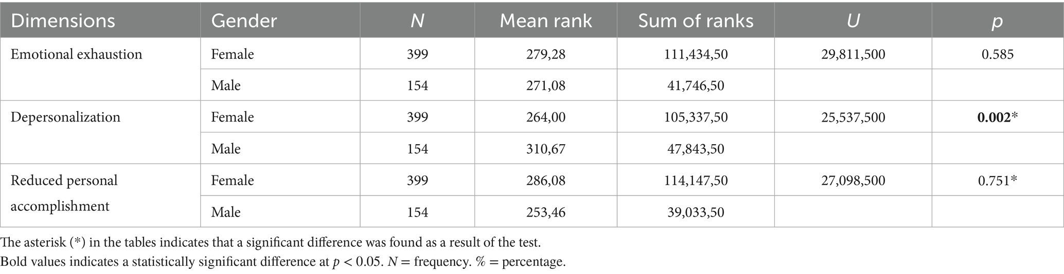 Table 7. Mann–Whitney U-test results on burnout score differences of participants’ gender.